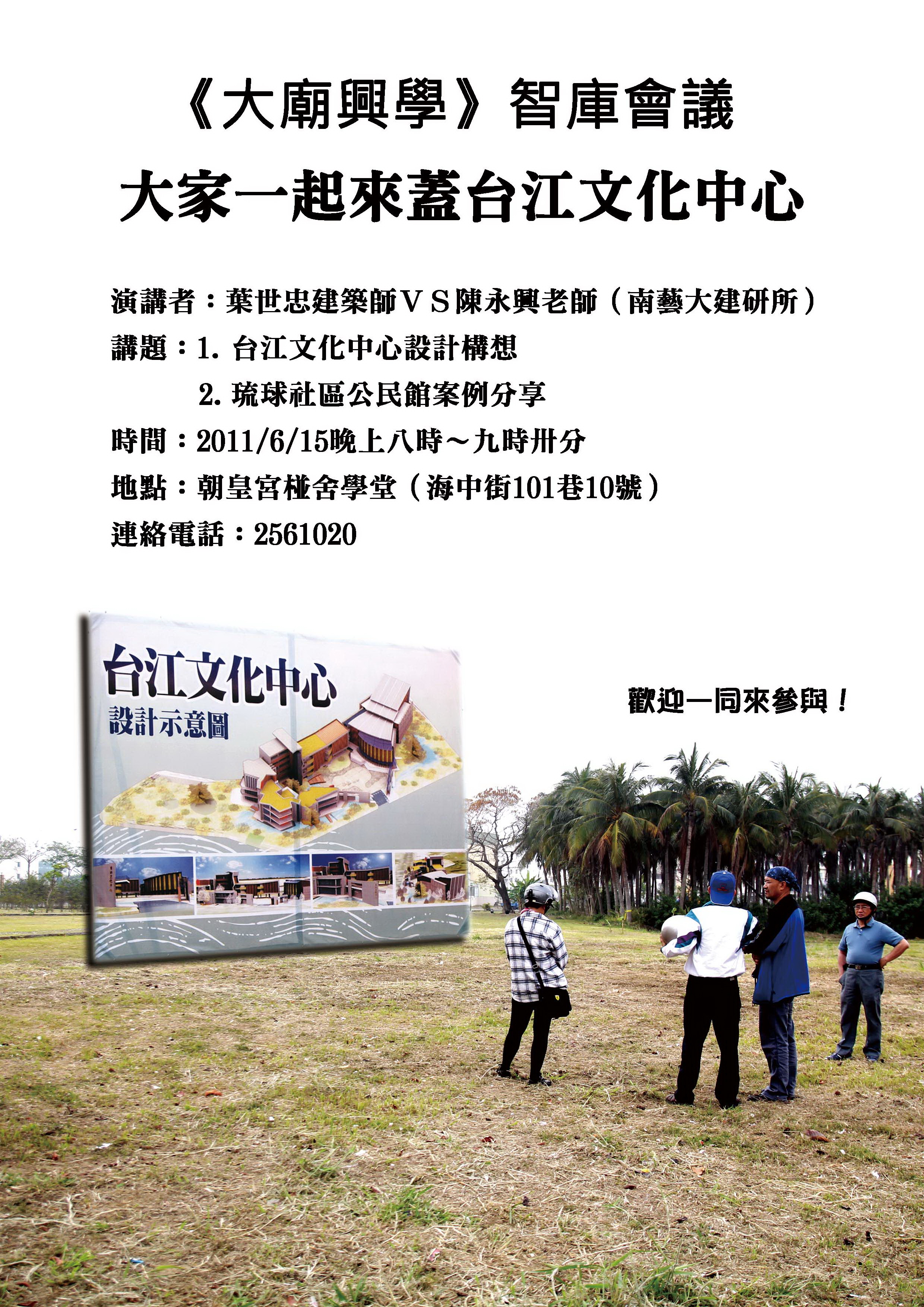 就在6月15日晚上八點到九點半,我們在海尾朝皇宮舉辦一起「大家一起來蓋台江文化中心智庫會議」,